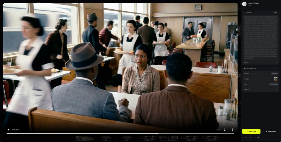 In one episode, a scene focuses on Hugh Burnett and his group entering restaurants to test whether Black Canadians would be served. The moment needed to show quiet resistance, long waits, and the contrast between who was being served and who wasn’t. Because no real footage exists of these moments, the entire scene was built using AI.